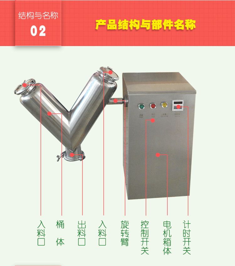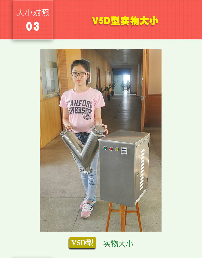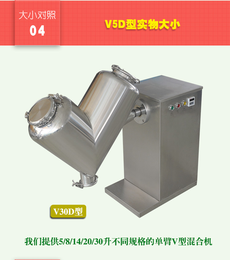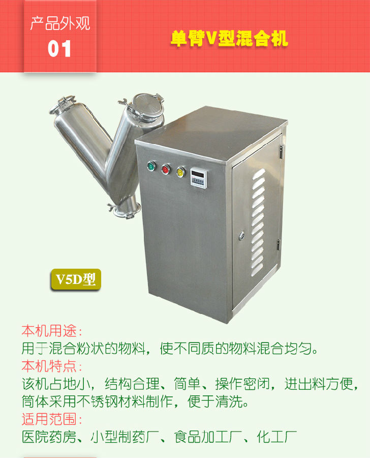 ?? 單臂V型混合機利用兩個不對稱的料筒,采用重力混合,物料在料筒內不斷聚中,不斷分散,一般經過5~15分鐘左右時間混合,使兩種或兩種以上充分混合均勻,特別適合對兩種或兩種以上的粉、粒狀物料,比重懸殊較大的混合,混合均勻度達99%以上,混合筒體內外壁經精密拋光處理,表面光滑、平整、無死角、易清洗,本機與三維混合機、槽型混合機等產品功效齊全。
